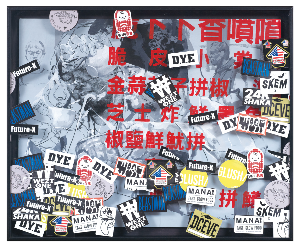 Oil on canvas and sticker on acrylic sheet · 101 x 123cm
