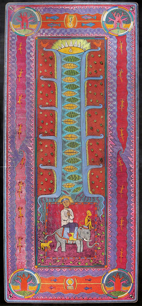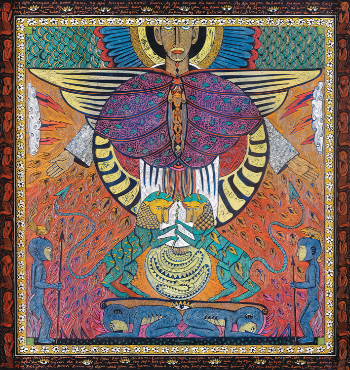 Hand coloured carved rubber · 122cm x 114cm